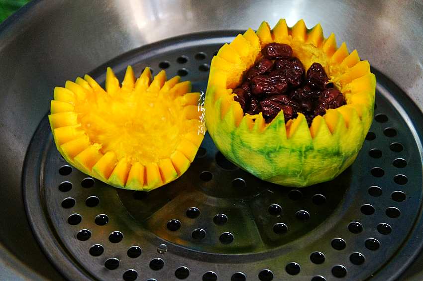 7、上屉蒸半小时左右,注意观察,后期可以用牙签扎一扎,熟透就关火,别蒸过了,蒸过了倭瓜会软掉;