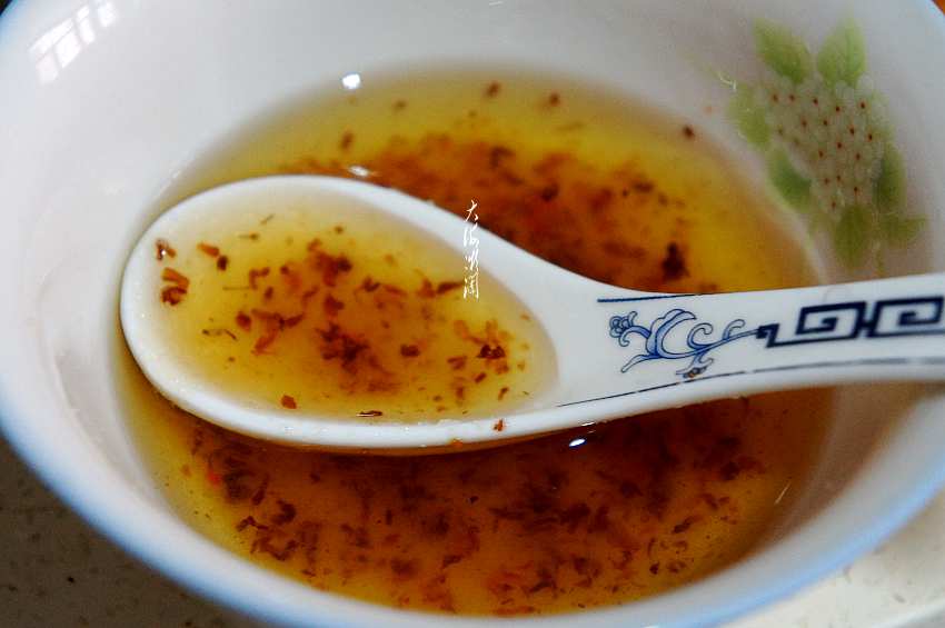 9、取小碗,加入一汤匙蜂蜜,适量的桂花酱,加少许蒸倭瓜水调成糖汁;