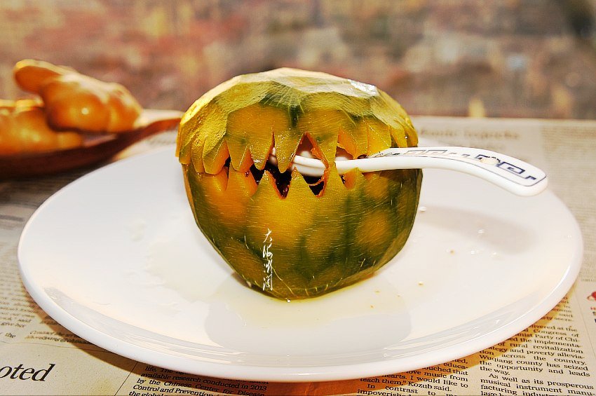 4、打开盖子,去掉瓜瓤,用勺子刮干净;