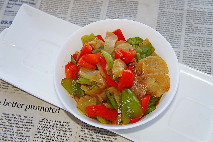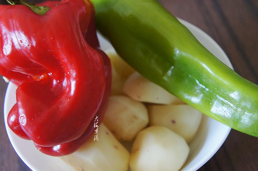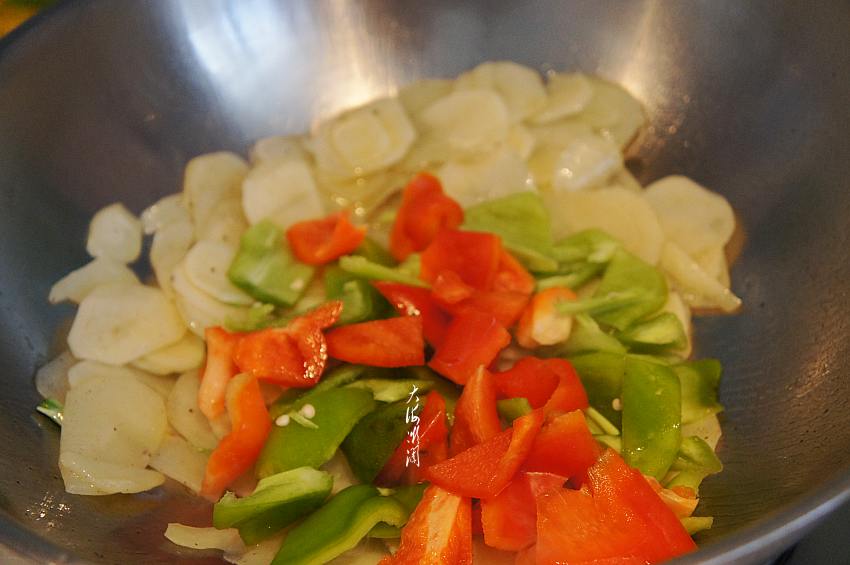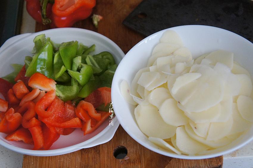 2、土豆切薄片,冷水浸泡5分钟左右,捞出控净水分。辣椒切块,红椒半个切块;