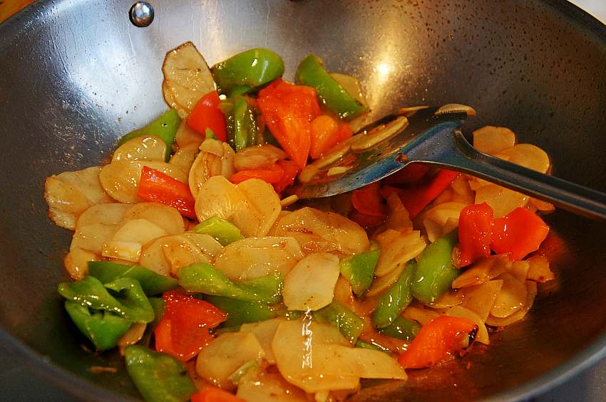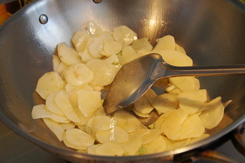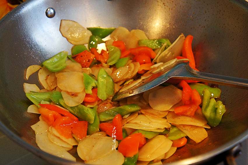 2、淋上一点水土豆片不会被炒碎,口感好。
