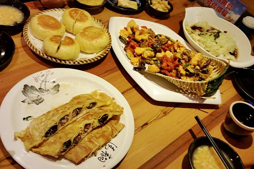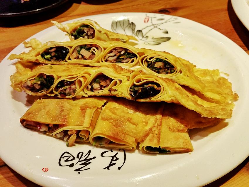 【软煎豆腐卷】26.80元/例;东北特色菜,有点蘸酱菜的味道,干豆腐里边卷上黄瓜条、胡萝卜丝、葱丝、木耳、火腿肠、豆芽、酱等等,然后上锅煎,非常好吃,东北人都爱吃的菜,既是菜也可当主食,这一盘子都吃光了。