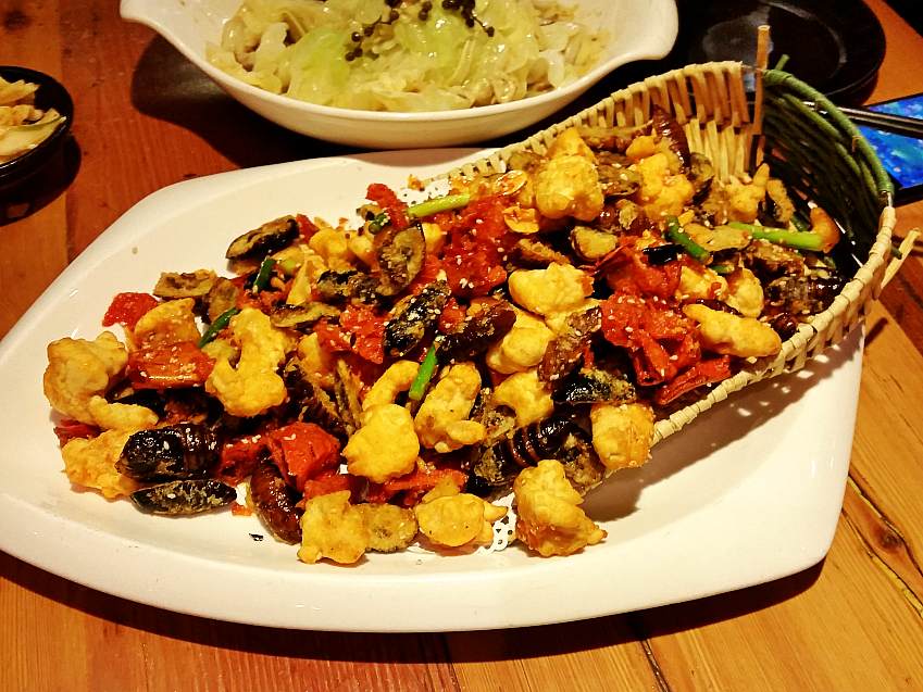 【一品蚕香肉】38.80元/例;这卖相还挺赞的,这个小簸萁虽然不怎么精致,却也给这道菜增光不少,只是桌子太拥挤,没拍出特色来,这道菜炸的很香酥,尤其里边的蚕蛹炸的特别酥脆,可以连皮吃掉,特别有味道,我很喜欢里边酥脆的红椒,肉段儿是鸡胸肉块儿,外焦里嫩,里边还有花生米,总之这道菜就是香酥脆,倍儿好吃。