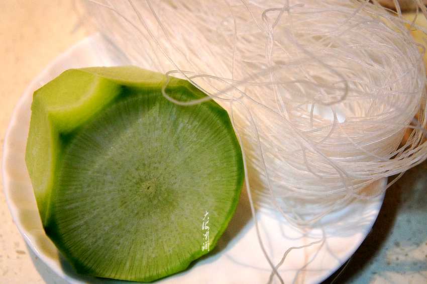 做法:1、准备材料,萝卜是从姐家拿来的自家产的有机萝卜,去皮洗净备用,粉丝洗净备用;