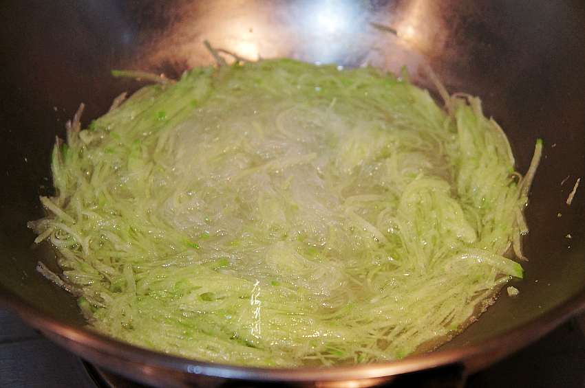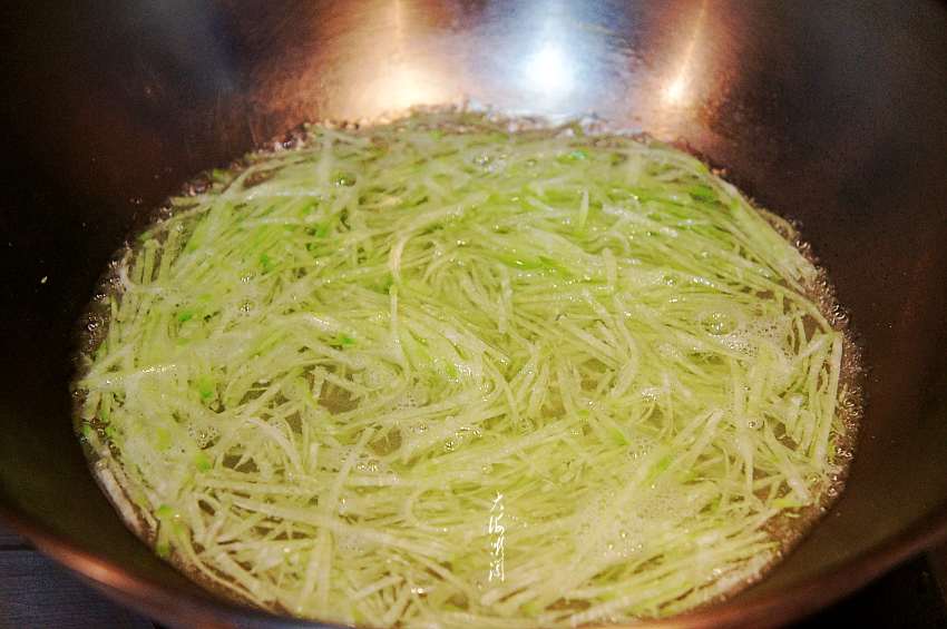 2、这种做法,要先烧开水,在下入萝卜条,这样做口感好,否做煮烂就不好吃了。