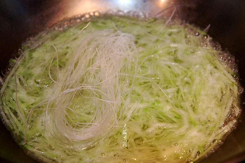 3、粉丝也有耐煮和不耐煮的,所以下入粉丝后一定注意观察,粉丝完全变软透明就关火,可以稍稍欠点火,出锅汤中泡一会就好,别煮过了,粘成一坨就没法吃了。