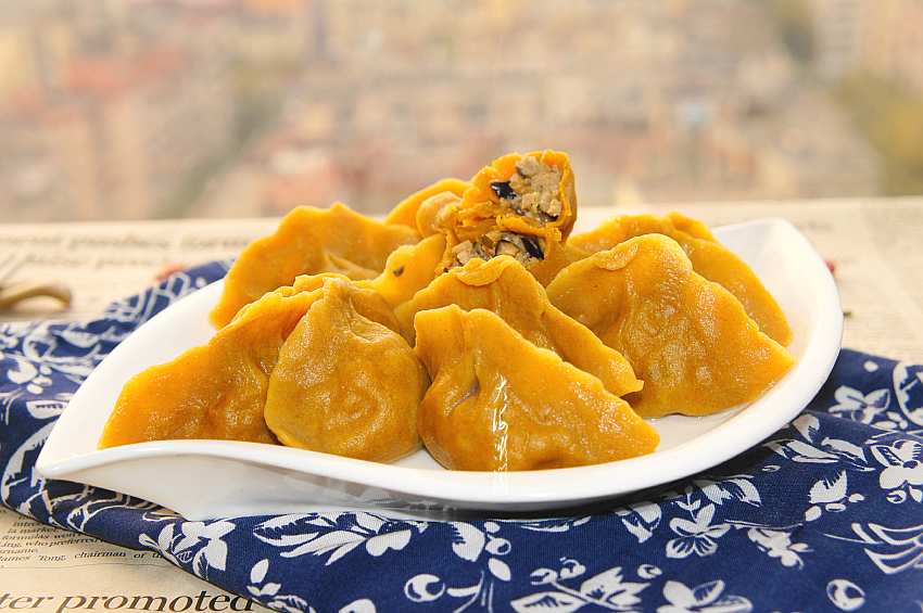 【茄子馅水饺】所需食材:面粉400g;南瓜泥适量;里脊肉400g;茄子2个;葱1根;姜适量;花椒油适量;盐适量;五香粉适量;胡椒粉适量;蘑菇粉适量;生抽适量。