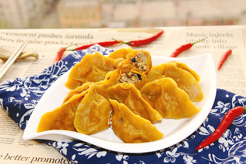 今天这饺子营养可是丰富了,看这颜色就知道面粉加了南瓜,赶巧家里没有高筋粉了,只有全麦面粉,这粉真黑,直接做出来的食物感觉没有食欲的,每次用全麦粉都会给它加点料,所以这个黄是黑与黄的搭配,颜色发深。不过面粉经过过筛,更细腻一些,口感很好,还挺耐煮的,一个也没煮坏。面粉与南瓜都富含粗纤维,能清理胃肠垃圾,是治疗便秘和减肥的绝妙良方,大家平时可以多吃点。当然最营养的还是馅料,我在乡下吃的茄子馅儿是用五花肉搭配茄子和辣椒包的,五花肉和茄子辣椒都切小丁,而且茄子是去皮的,有酱香的味道,微辣的口感,真香。难得紫皮最有营养,我没有去皮,也没用五花肉,小朋友不吃肥肉,冰箱里找出一块里脊肉,同样切细小的肉丁,这水饺香而不腻,味道还真鲜美,非常好吃。