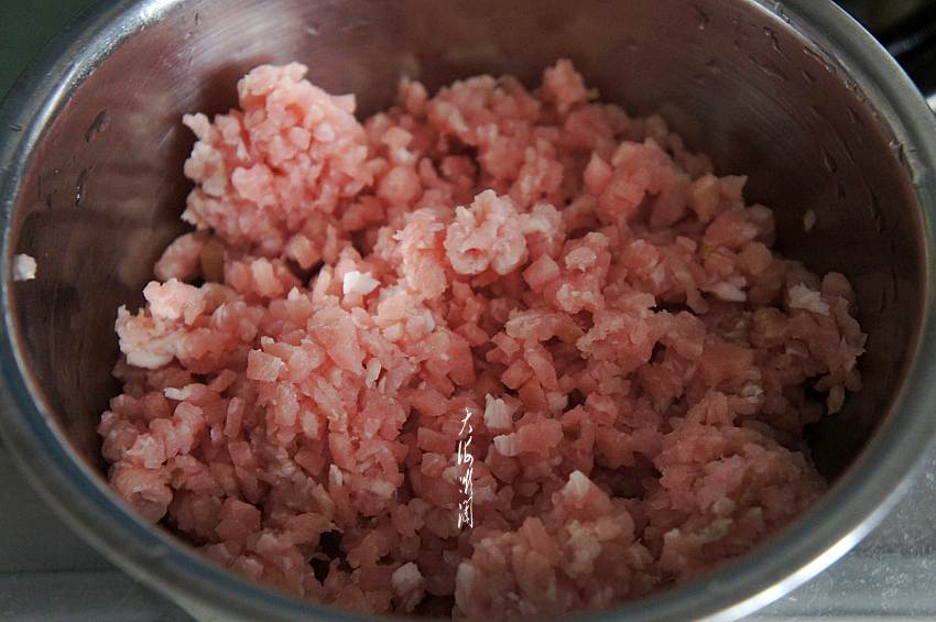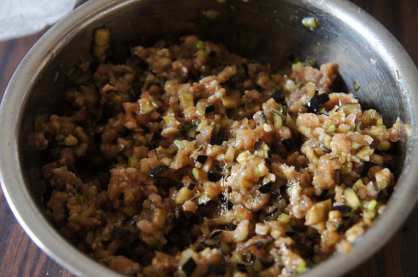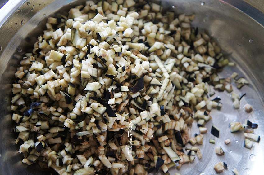 6、茄子攥掉水分,加入肉馅中拌匀;