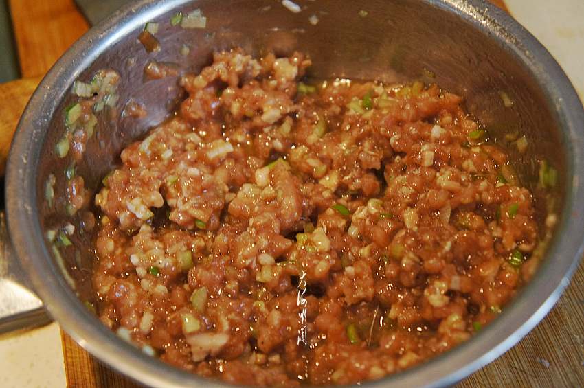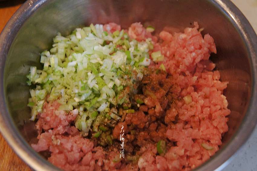 4、葱、姜去皮洗净切碎,加入肉馅中,葱可以多放一点,加入胡椒粉、五香粉、生抽、少许老汤,沿着一个方向搅拌上劲;