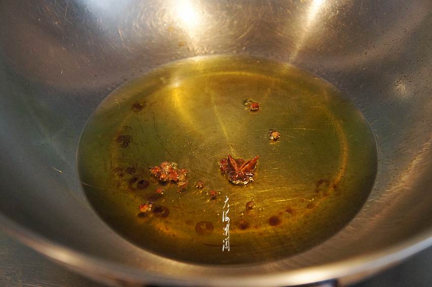 4、炒锅加入适量的菜籽油烧开,加入花椒粒和八角炸糊捞出扔掉便是花椒油;