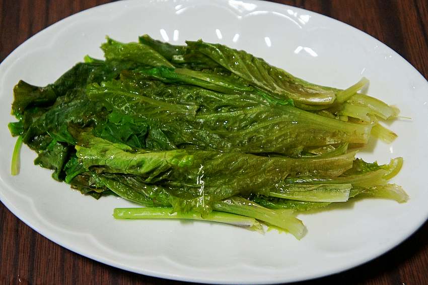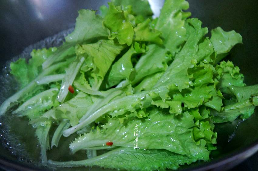 4、炒锅加入适量的水加几滴植物油烧开,下入生菜焯几秒钟立即捞出,过冷水控净水分;