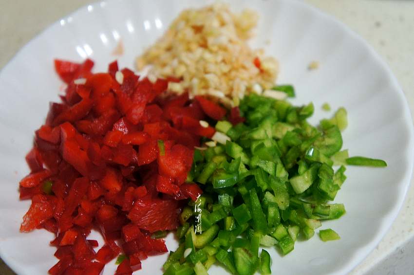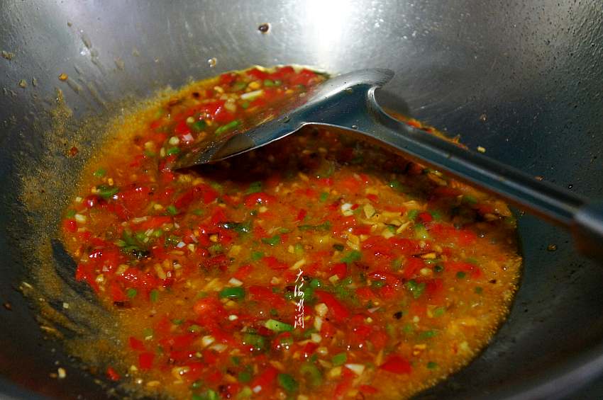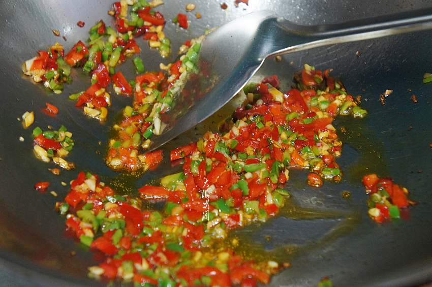 6、炒锅加入适量的油,爆香五香粉和大蒜碎,加入青红椒碎翻炒;