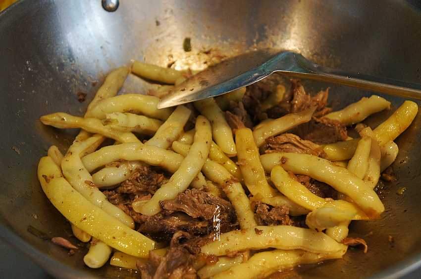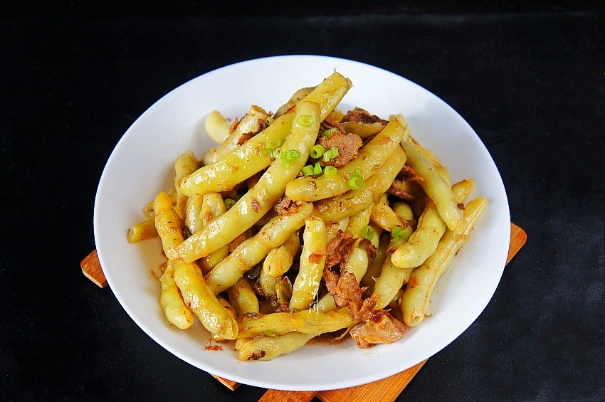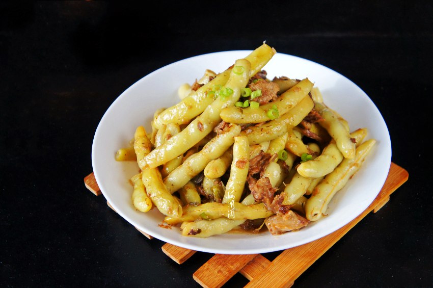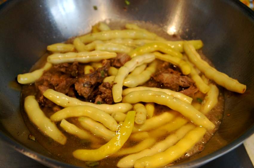 3、炒至豆角变色,加入熟肉翻炒均匀,实际上也是拆骨肉;