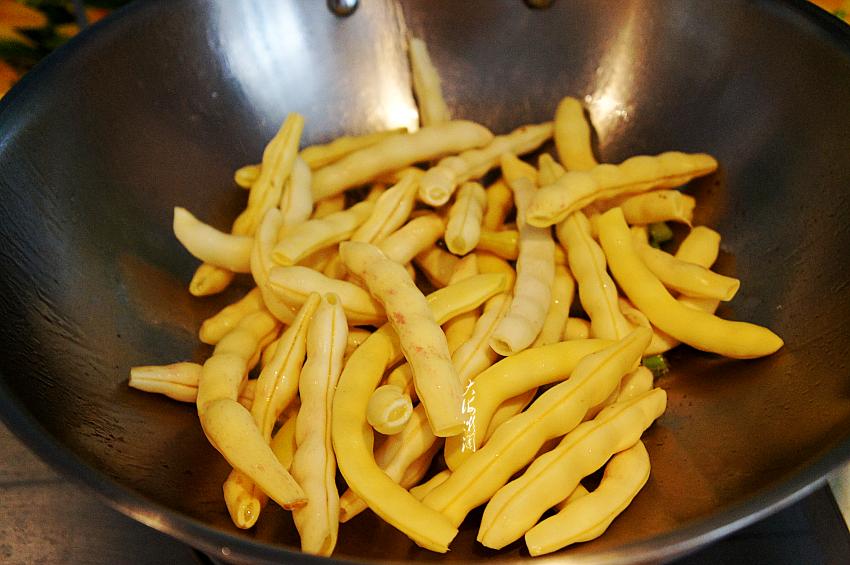 2、炒锅加入适量的油,爆香五香粉和葱花,加入黄豆角翻炒;