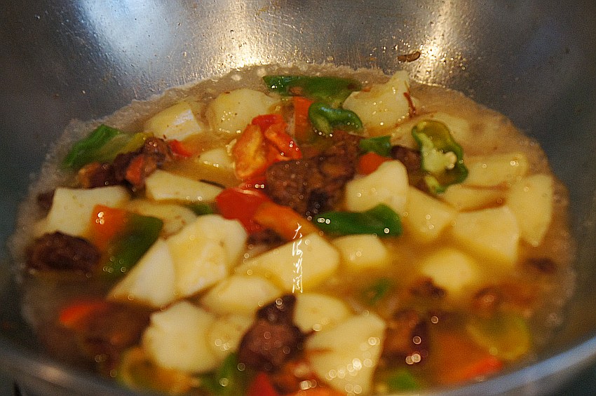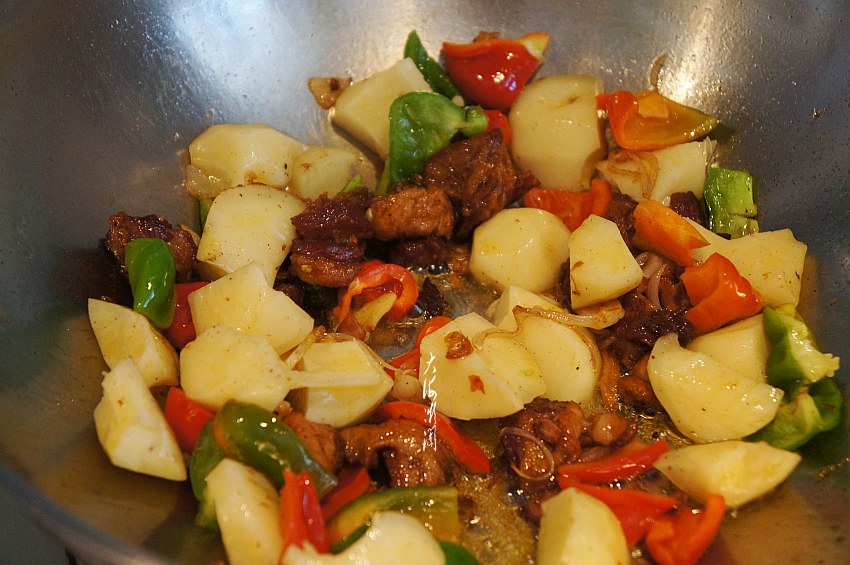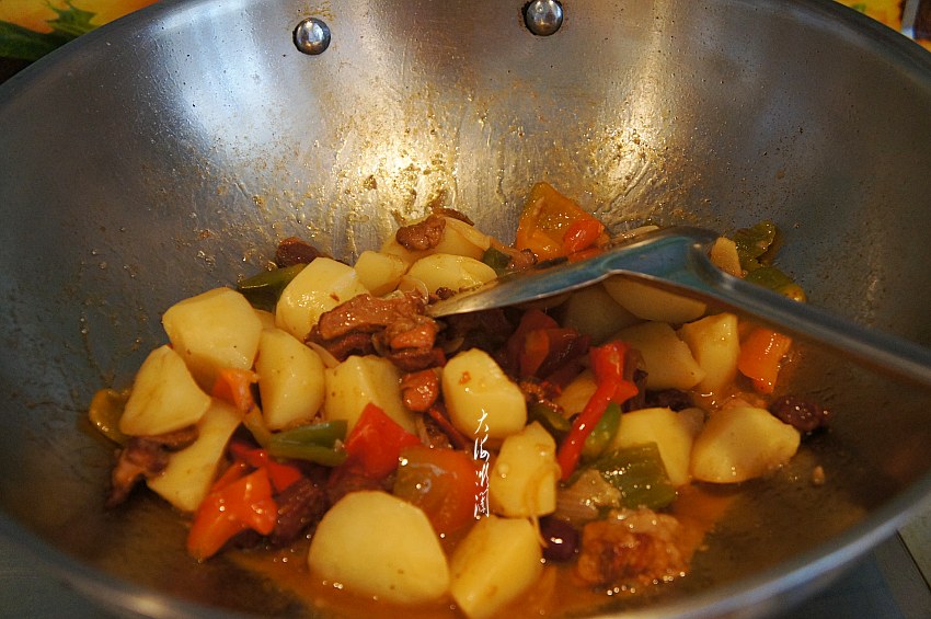 5、加入土豆和青椒翻炒,再加入少许老抽翻炒;