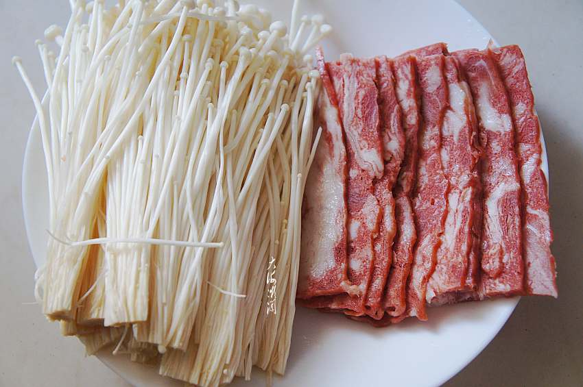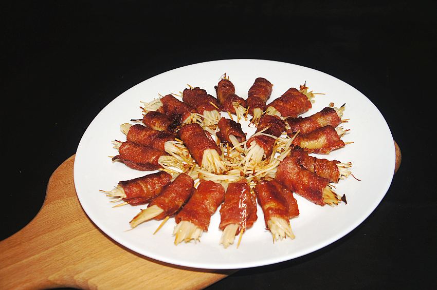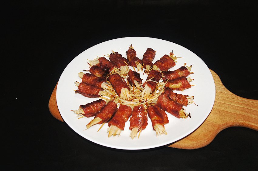 金针菇作为秋冬最美味的食用菌,口感滑嫩,柄脆,清香扑鼻,味道鲜美,深受大众的喜爱。也是我家餐桌上的常青树,涮火锅必备的食材,与培根肉荤素搭配,无论是炒还是烤,这两者搭配都是家人的大爱,金针菇浸润了培根肉的香,同时又化解了培根肉的腻,味道互曾,营养互补。 金针菇的营养价值非常高,富含人体必需的氨基酸成分较全,其中赖氨酸和精氨酸含量尤其丰富,对增强智力尤其是对儿童的身高和智力发育有良好的作用,人称“增智菇”。金针菇中还含有一种叫朴菇素的物质,有增强机体对癌细胞的抗御能力。金针菇可抑制血脂升高,降低胆固醇,防治心脑血管疾病。而且金针菇含锌量比较高,有促进儿童智力发育和健脑的作用。培根肉味道极好,西餐中一般用作多种菜肴的配料,中餐更丰富,蒸、煮后可直接食用,还可搭配各种蔬菜同炒。培根中磷、钾、钠的含量丰富,还含有脂肪、胆固醇、碳水化合物等元素。具有健脾、开胃、祛寒、消食等主要功效。培根肉的营养成分容易被人体快速吸收和利用,起到滋补身体,缓解虚弱的作用。