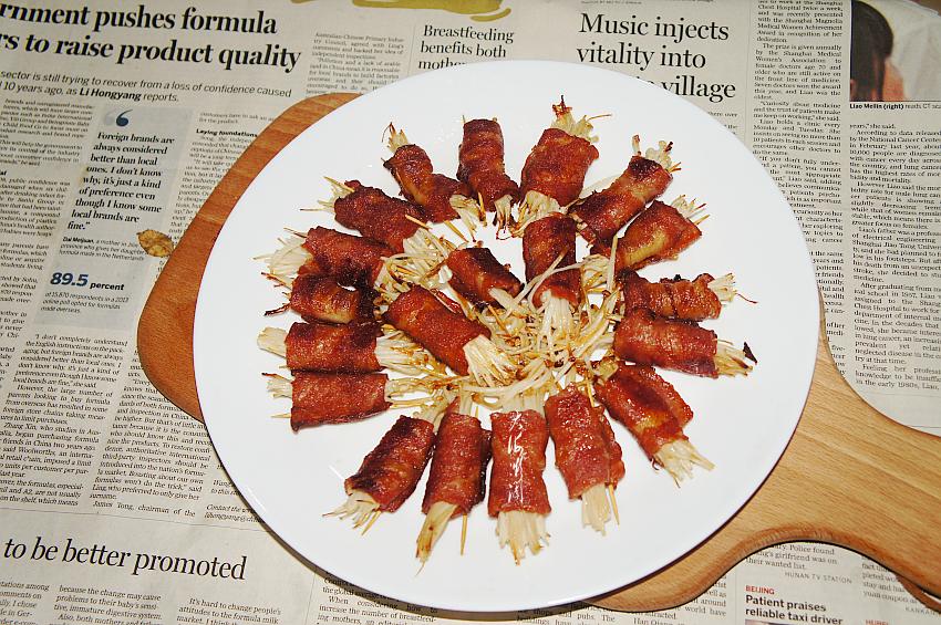 7、装盘。鲜嫩味美的金针菇培根卷,好吃到停不下来。