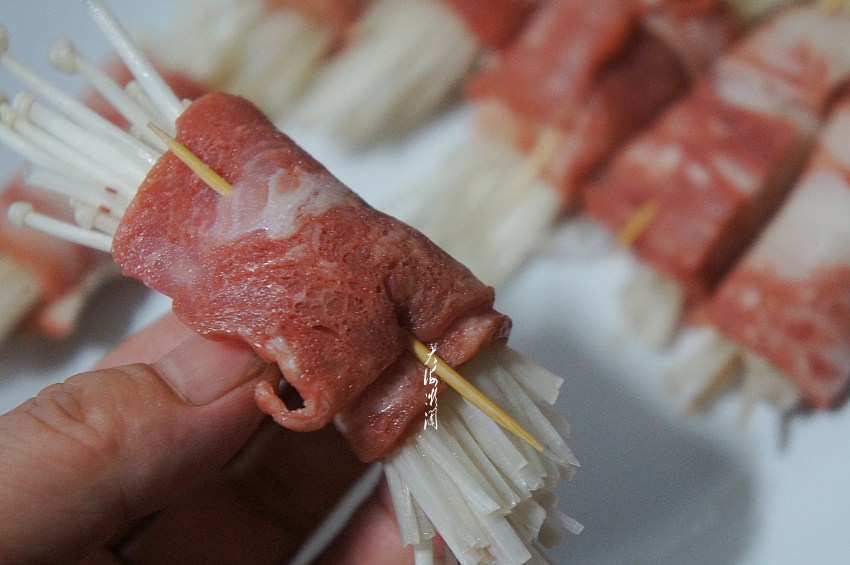 2、取一份金针菇,用培根肉卷起来,然后用牙签固定;