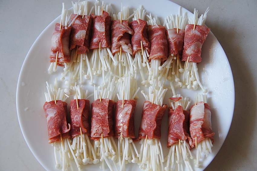 3、将所有的金针菇分成若干份,分别用培根肉卷起来,用牙签固定好;
