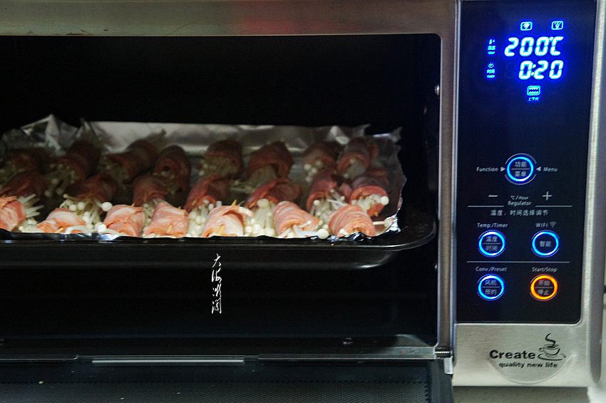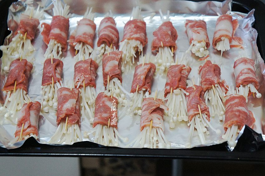 4、烤盘铺上锡纸,注意亚光面朝上码放食物,将做好的金针菇培根肉卷码入烤盘;