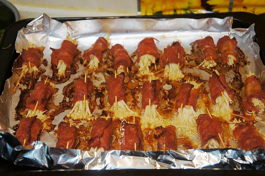 6、烤好的金针菇培根肉卷出炉,培根肉里边的油脂基本释放出来了,这样吃起来就不用担心增加脂肪了;