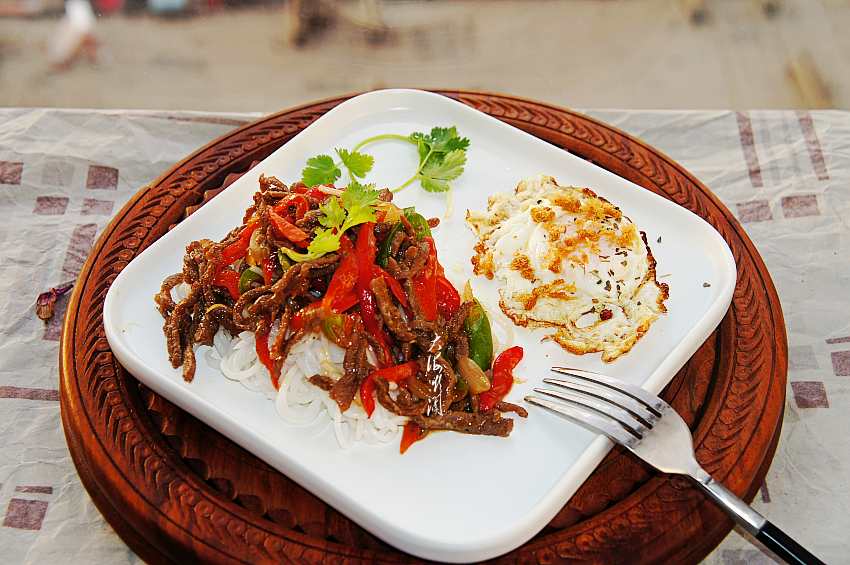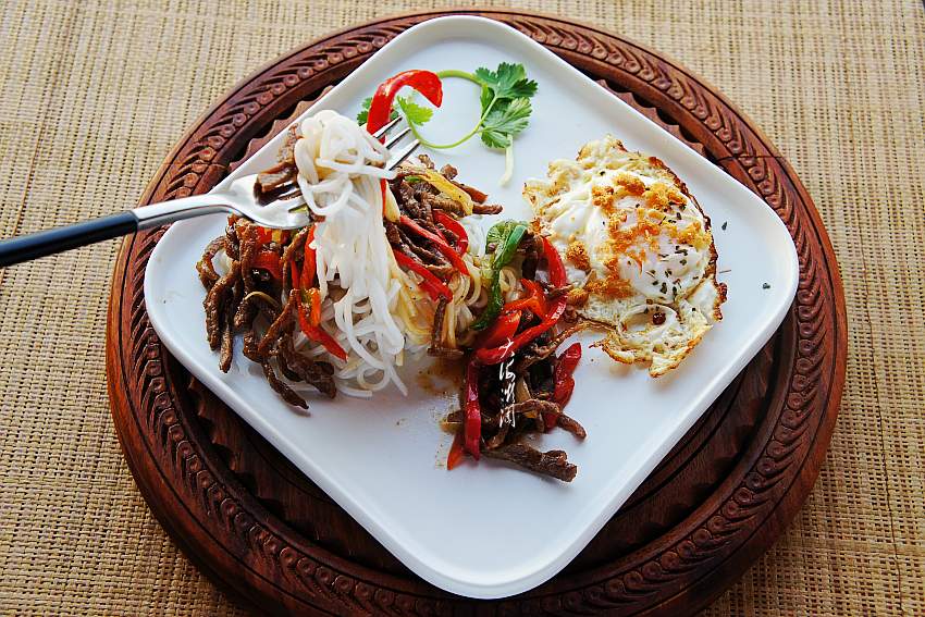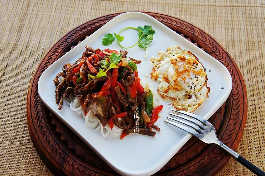 9、鸡蛋码盘,捞出米线装盘,浇上黑椒肉丝,就OK啦!喜欢香菜的还可以撒点香菜。