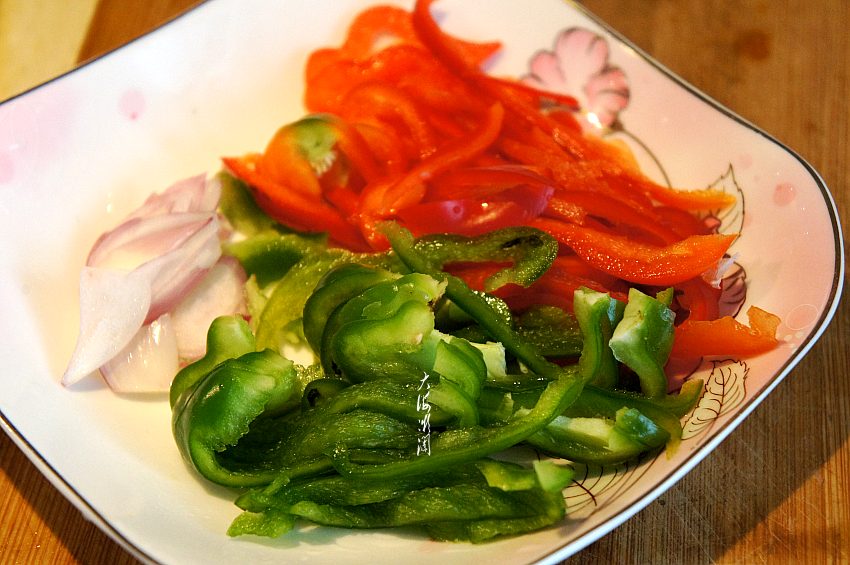 2、青红椒洗净切丝,毛葱去皮洗净切片;