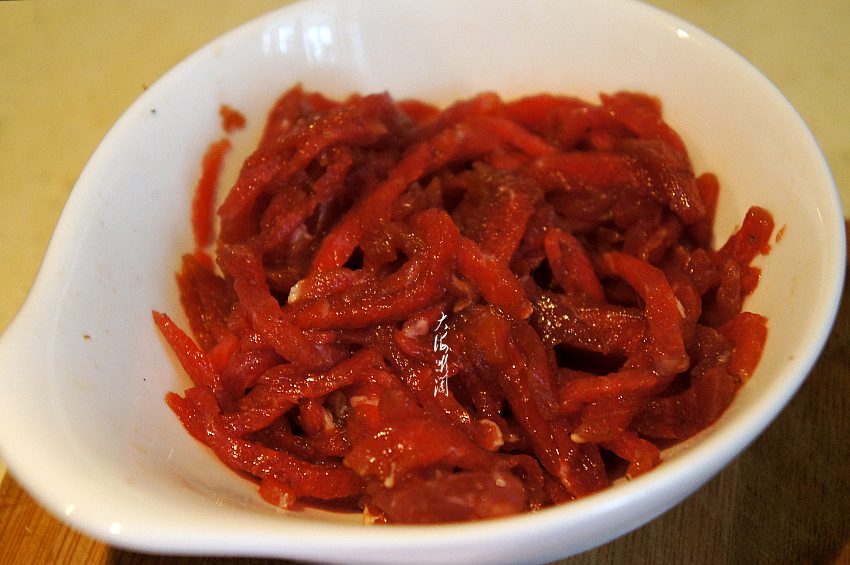 3、牛肉洗净切丝;加入料酒、生抽、蚝油腌制10分钟;