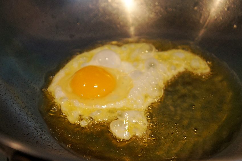 6、炒锅加入适量的油,打入鸡蛋,小火煎熟,煎蛋随意,不喜欢吃煎蛋的可以不做;