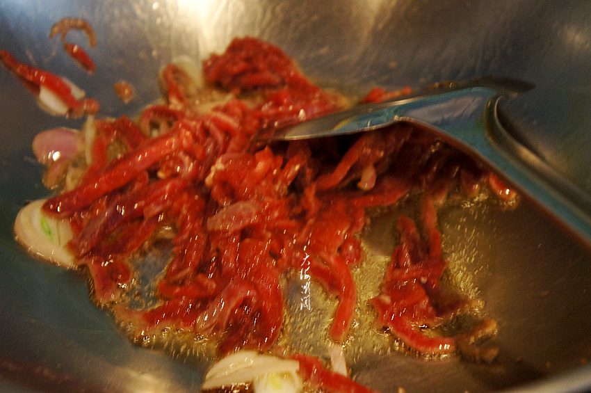 7、炒锅加入适量的油,爆香五香粉和葱花,加入腌制好的牛肉丝翻炒;
