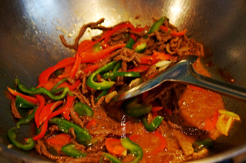 8、加入青红椒丝翻炒,加入盐、黑胡椒粉、蚝油调味,淋入少许湿淀粉勾薄芡,喜欢吃辣的在肉丝中加入辣酱也是非常美味的;