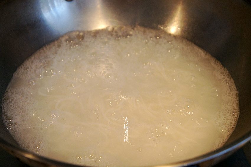 4、炒锅加入适量的水,水开下入米线煮3分钟左右,边煮边搅动;