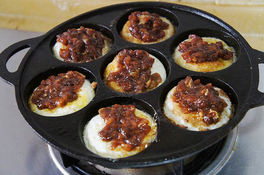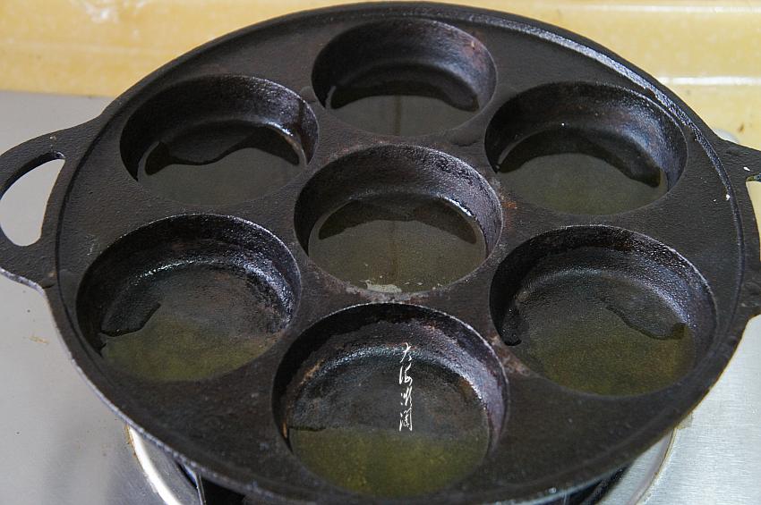 3、蛋堡锅小火慢慢加热,每一个模子中都加入少许油;