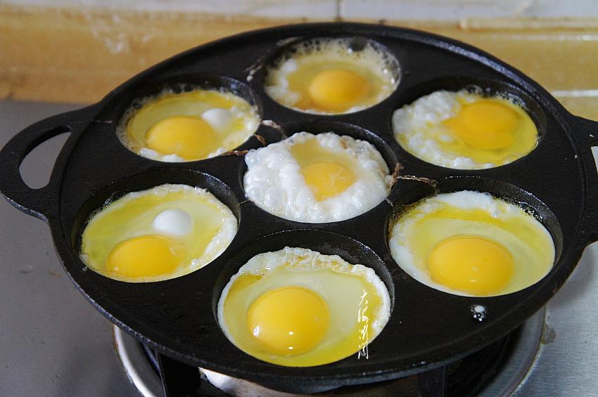 4、快速打入鸡蛋,最好在打入鸡蛋之前加少许面糊在底部,不过这个模子有点小,一个鸡蛋基本上灌满了,所以只能直接打鸡蛋,否则后边的肉馅放不进去了;