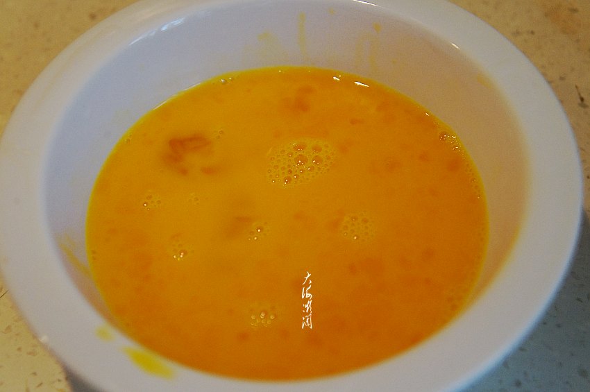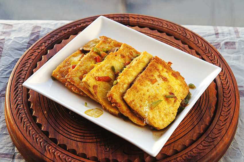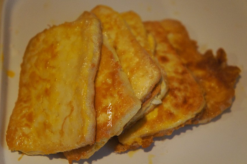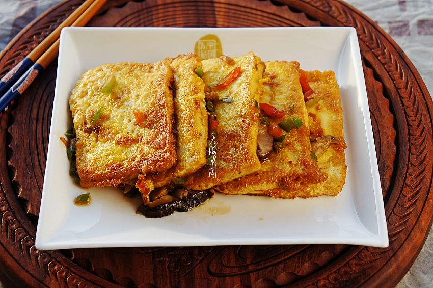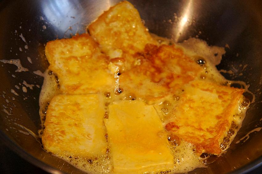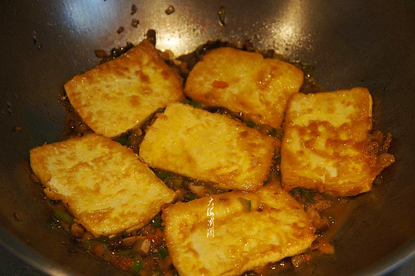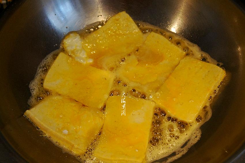 5、炒锅加入适量的油,每一片豆腐都裹上蛋液,入锅煎;