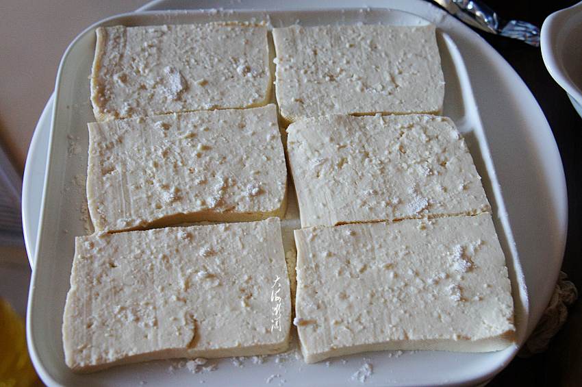 2、盘子底部撒些面粉,豆腐均匀的切成片放在盘中,上边再轻轻的拍上面粉;