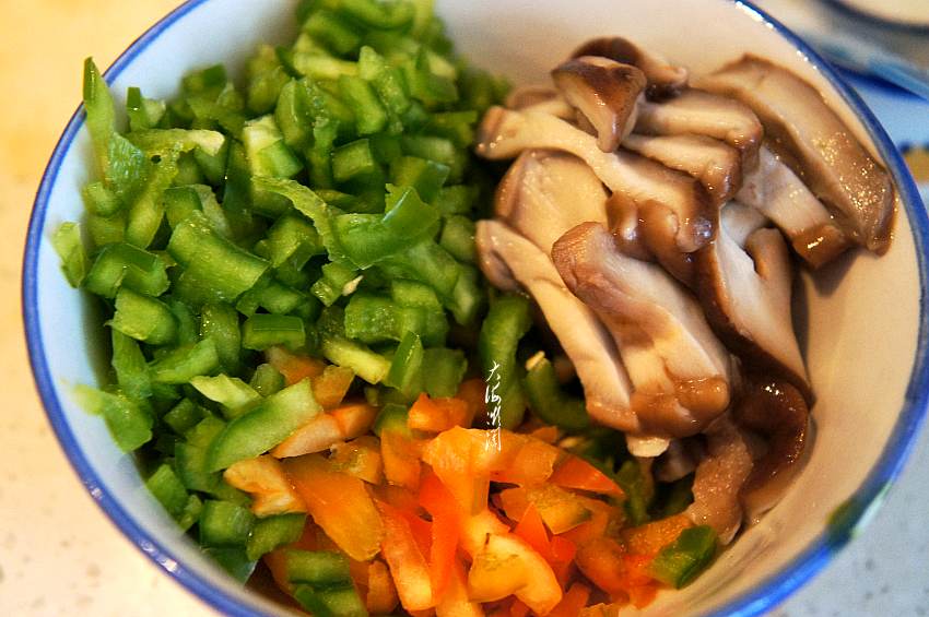 4、青椒、红椒洗净切小丁,香菇洗净焯水后再洗净切丝,葱姜去皮洗净切碎;