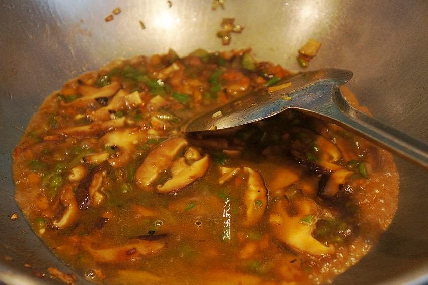 8、煎锅内再放少许油,爆香葱姜,加入青红椒、蘑菇翻炒,加入生抽、蚝油、盐调味,加半碗水,淋入少许的湿淀粉;