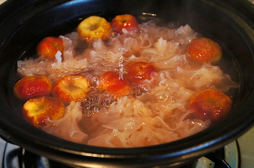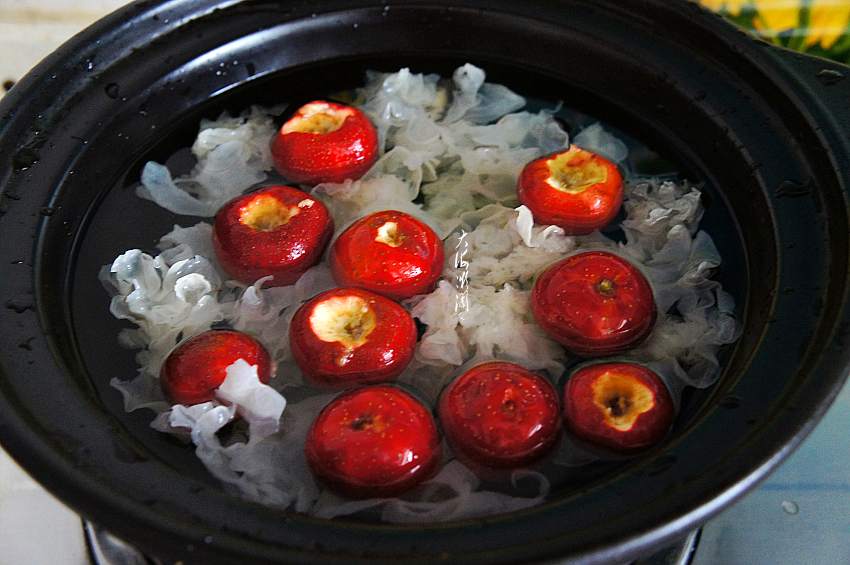 3、砂锅加入适量多的水,加入银耳和山楂,大火烧开,小火慢炖1小时左右;