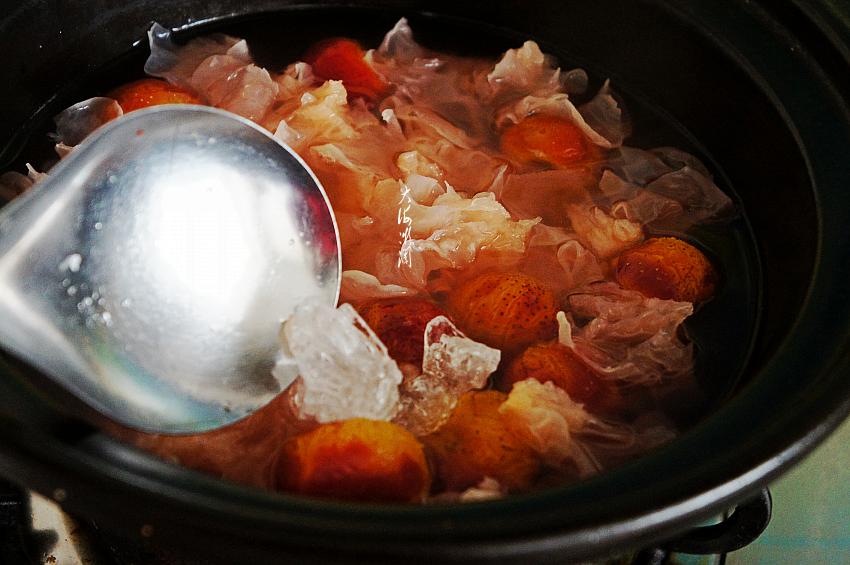 5、根据自己喜欢的口味加入适量的冰糖,继续小火煮至冰糖融化,汤汁粘稠即可;