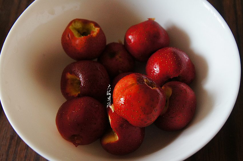 2、山楂加面粉浸泡后,反复清洗干净,去掉籽备用。山楂用量要根据自己喜欢的口味确定;
