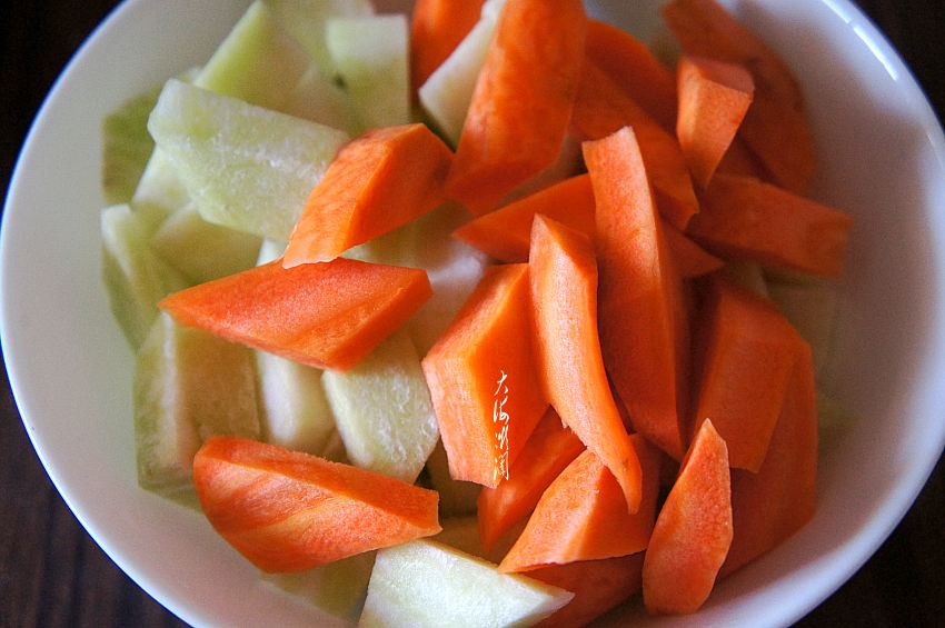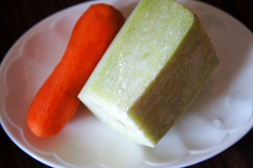 做法:1、备齐材料,胡萝卜去皮洗净备用,萝卜去皮洗净备用;