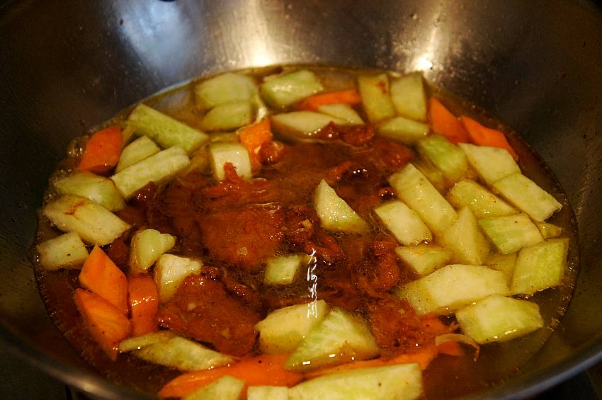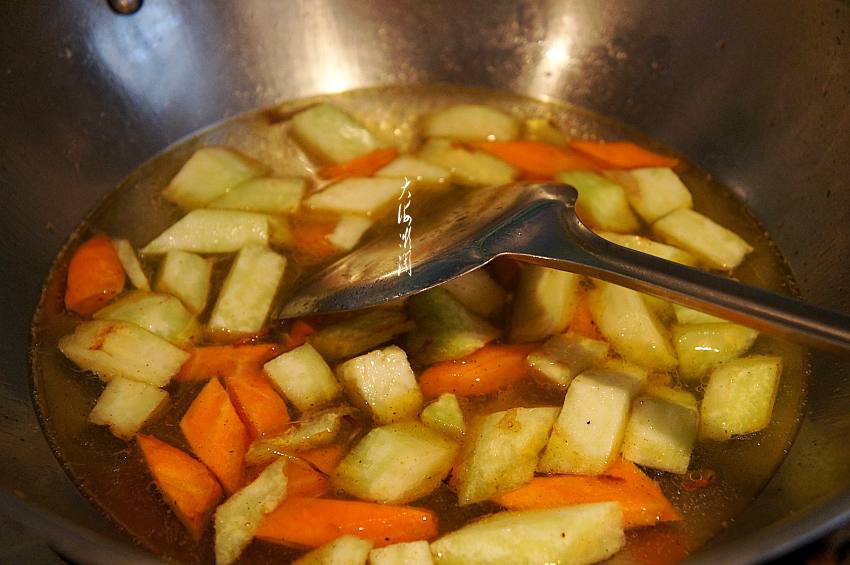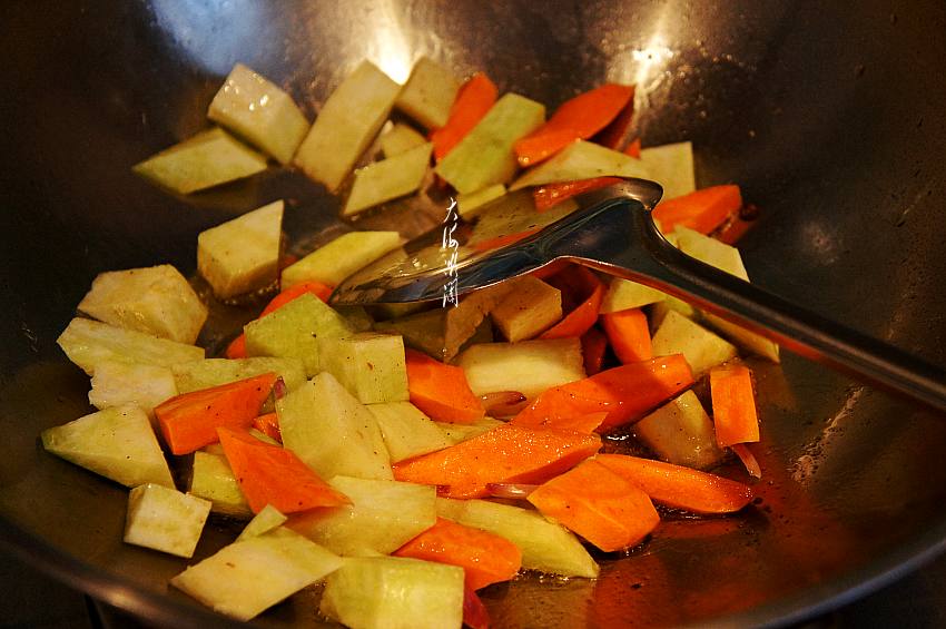 4、炒锅加入适量的水,爆香五香粉和葱花加,下入萝卜和胡萝卜翻炒;