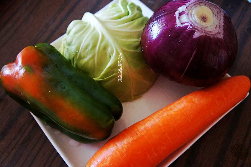 【什蔬香肠烤串】所需食材:科尔沁纯牛肉肠1根;青椒1个;胡萝卜半根;紫皮儿洋葱适量;甘蓝菜适量;叉烧酱适量;油少许。