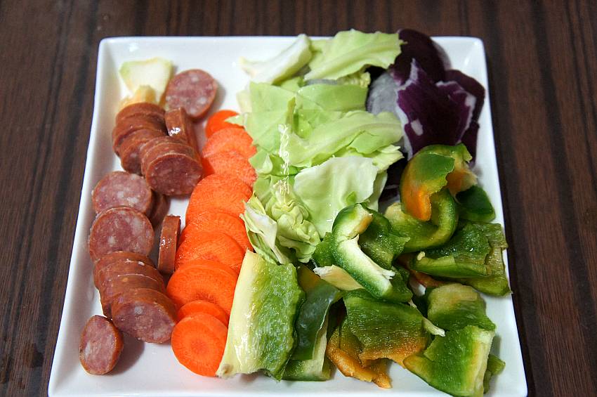 3、牛肉肠切片,胡萝卜切片;其他食材撕成块;