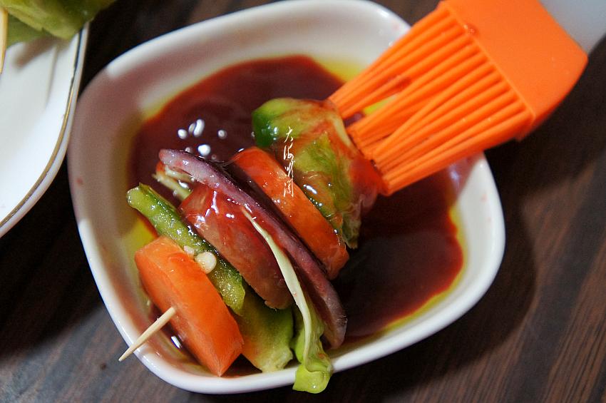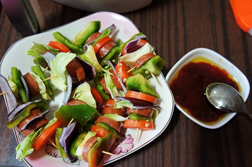 4、用牙签将各种食材搭配在一起穿起来,盘中加少许油,加入叉烧酱,无需调匀,喜欢咸口可以在酱中适量加点盐调匀;
