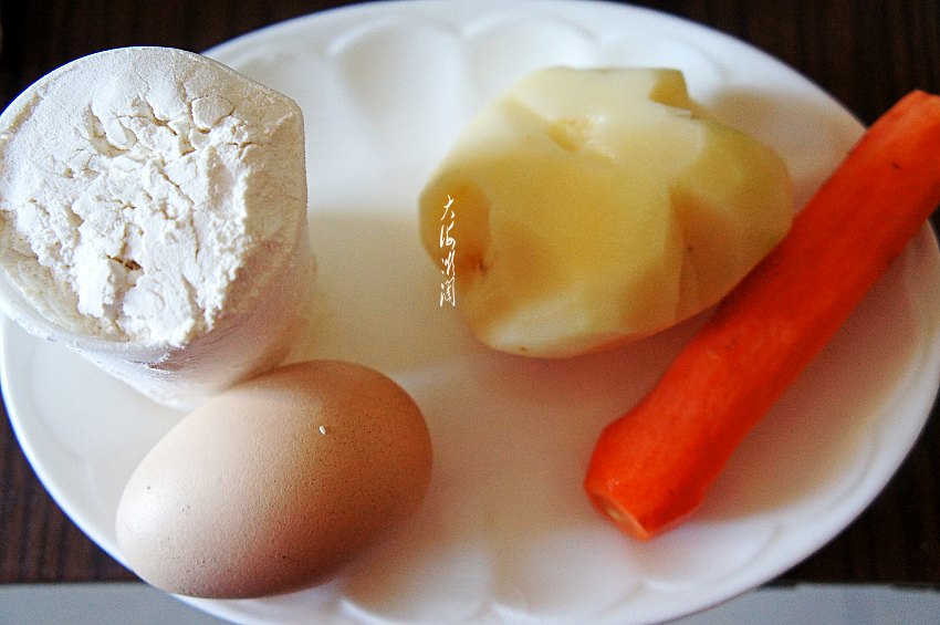 【胡萝卜土豆鸡蛋饼】所需食材:胡萝卜1根;土豆1个;鸡蛋1个;面粉100g;油适量;盐适量;胡椒粉适量。