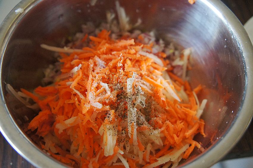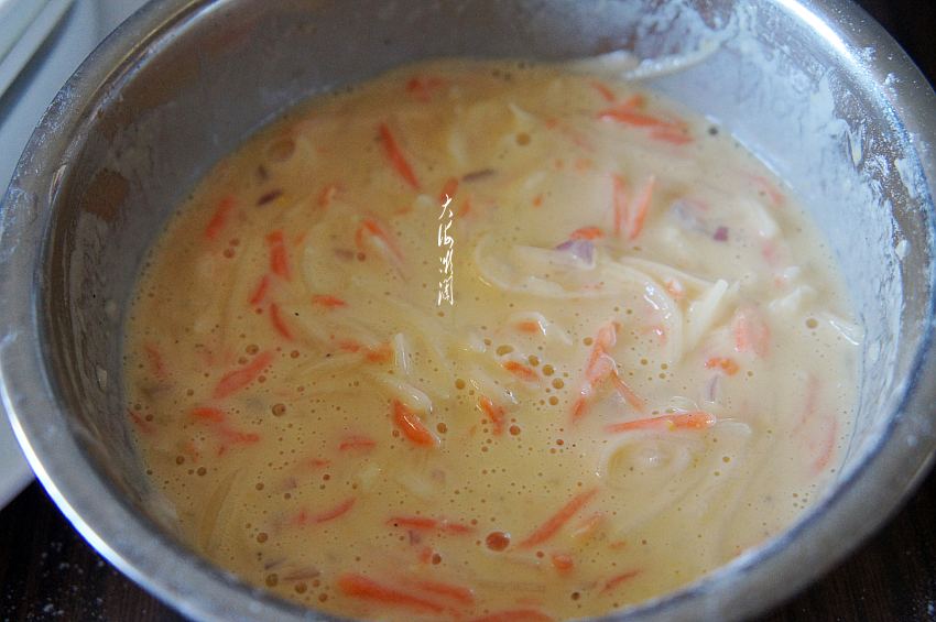2、土豆和胡萝卜分别用擦丝器擦成丝,加入盐、胡椒粉调味;