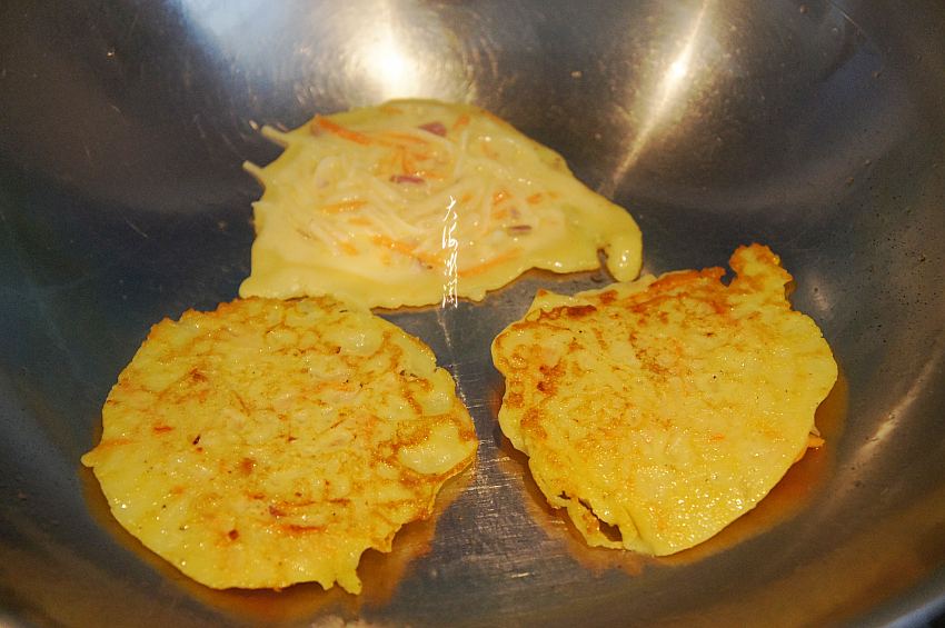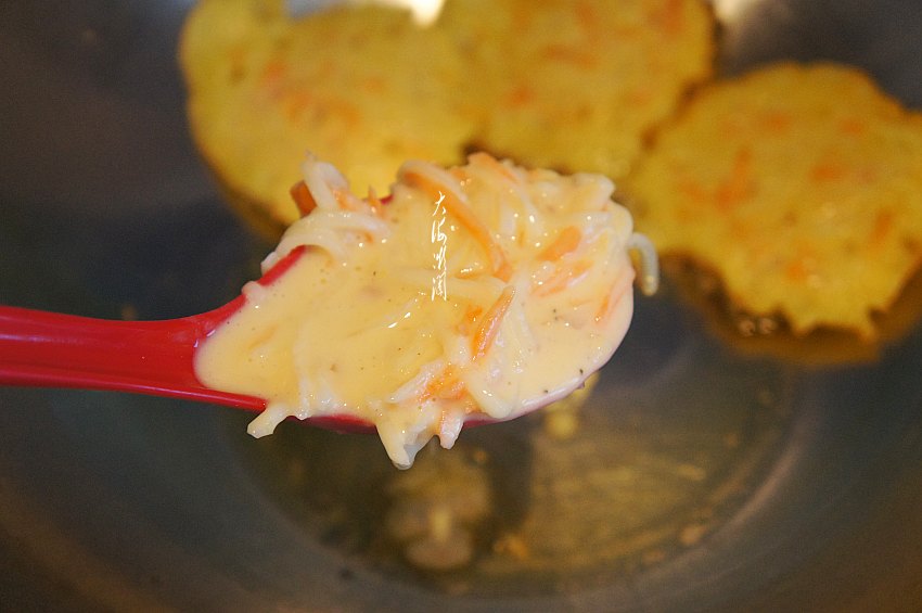 5、锅中加入适量的油,用汤匙一汤匙一个饼,入锅烙;